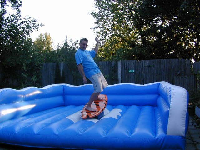 The surfing simulator comprises a inflatable, wave-themed bouncy base, with a solidly-mounted rocking surf board in the middle. Like all of our units it is regularly tested, cleaned and inspected, and is covered by our £10m public liability insurance. Our surfing simulator for hire is powered by a normal household 13amp plug socket, and we can supply a generator if your party is outdoors or away from a power supply.