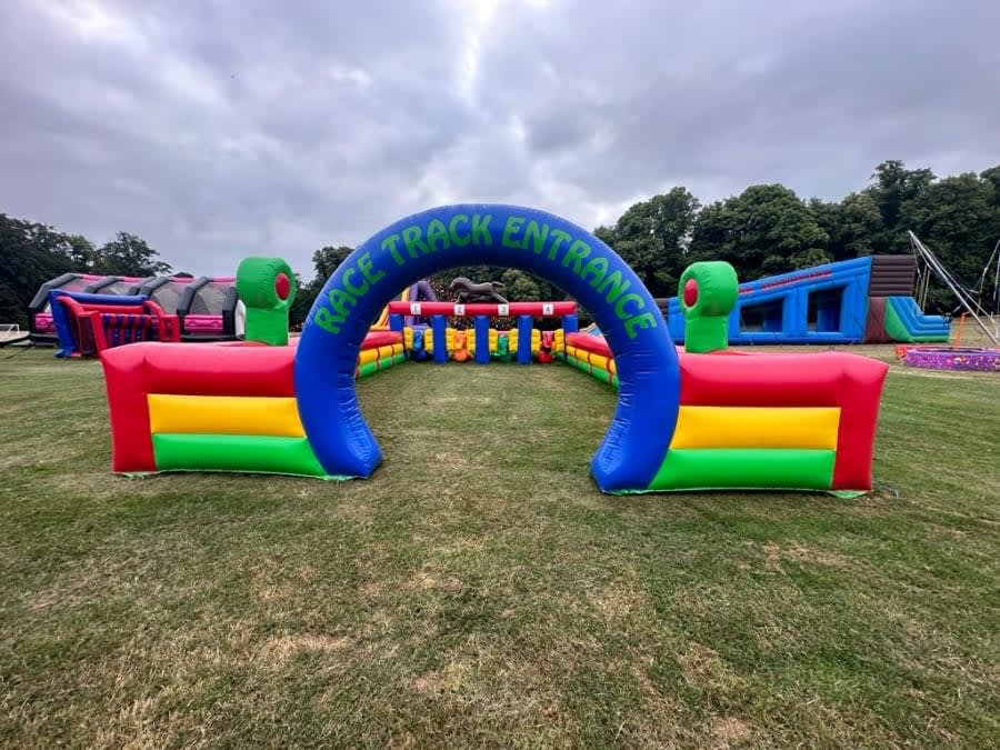 Each hire includes delivery, setup, inflatable horses, racing markers or lanes, safety mats, blowers, and insurance cover, with optional event staff to manage or host the races.